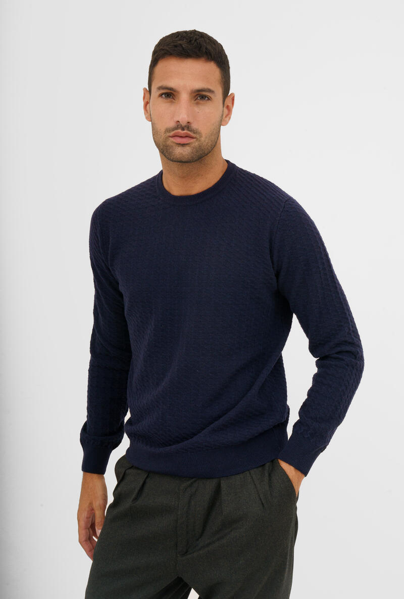 Girocollo realizzato in misto cashmere, arricchito da una lavorazione "all over". Una vestibilità moderna completa il look.