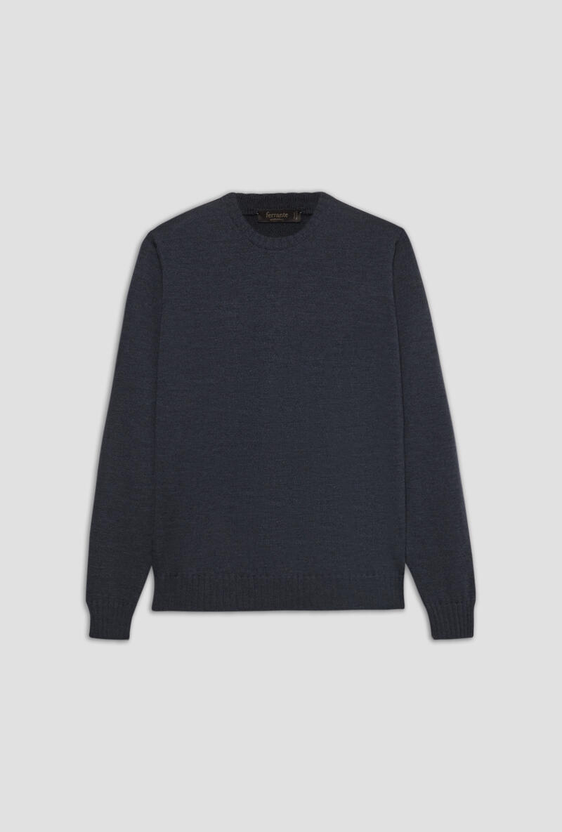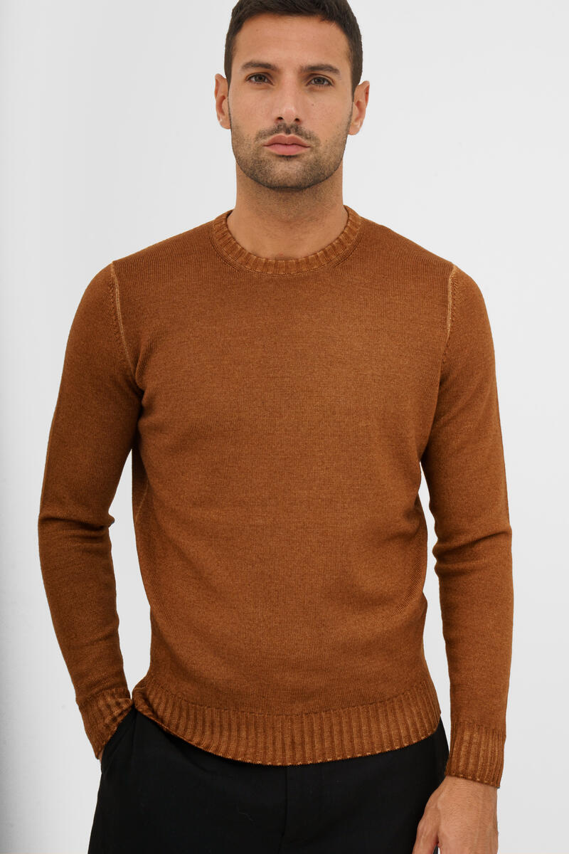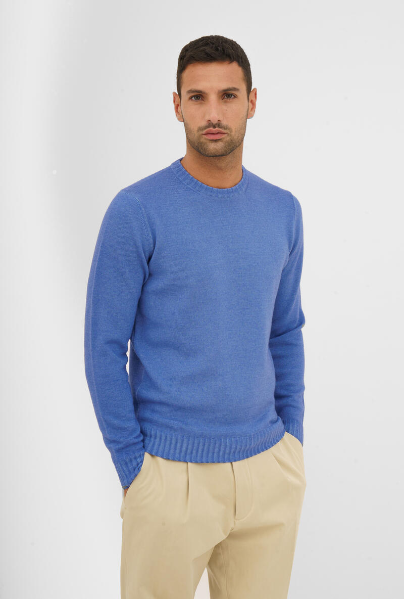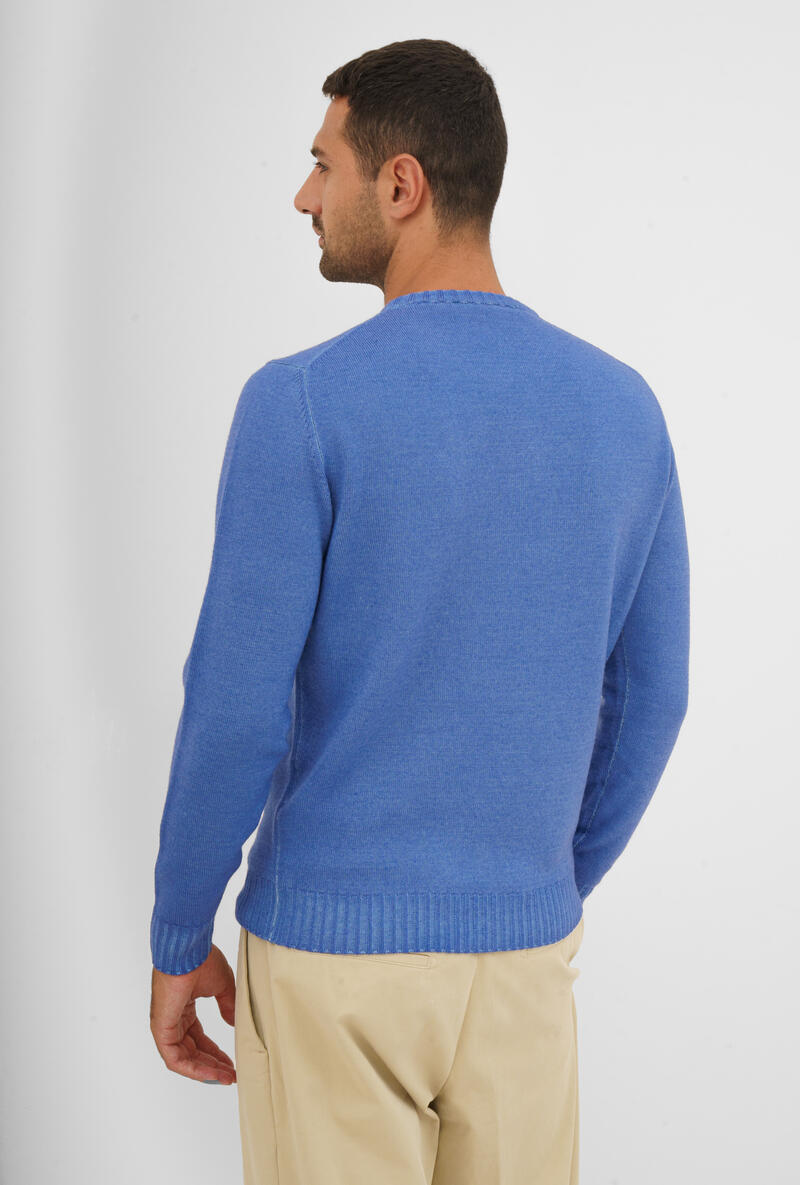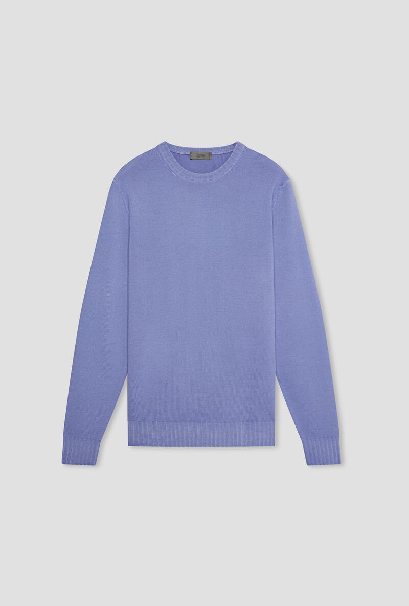 Girocollo in lana merinos extrafine, lavorato a due fili , una tintura effetto "fast dye" completa il look. La vestibilità slim arricchisce il capo.