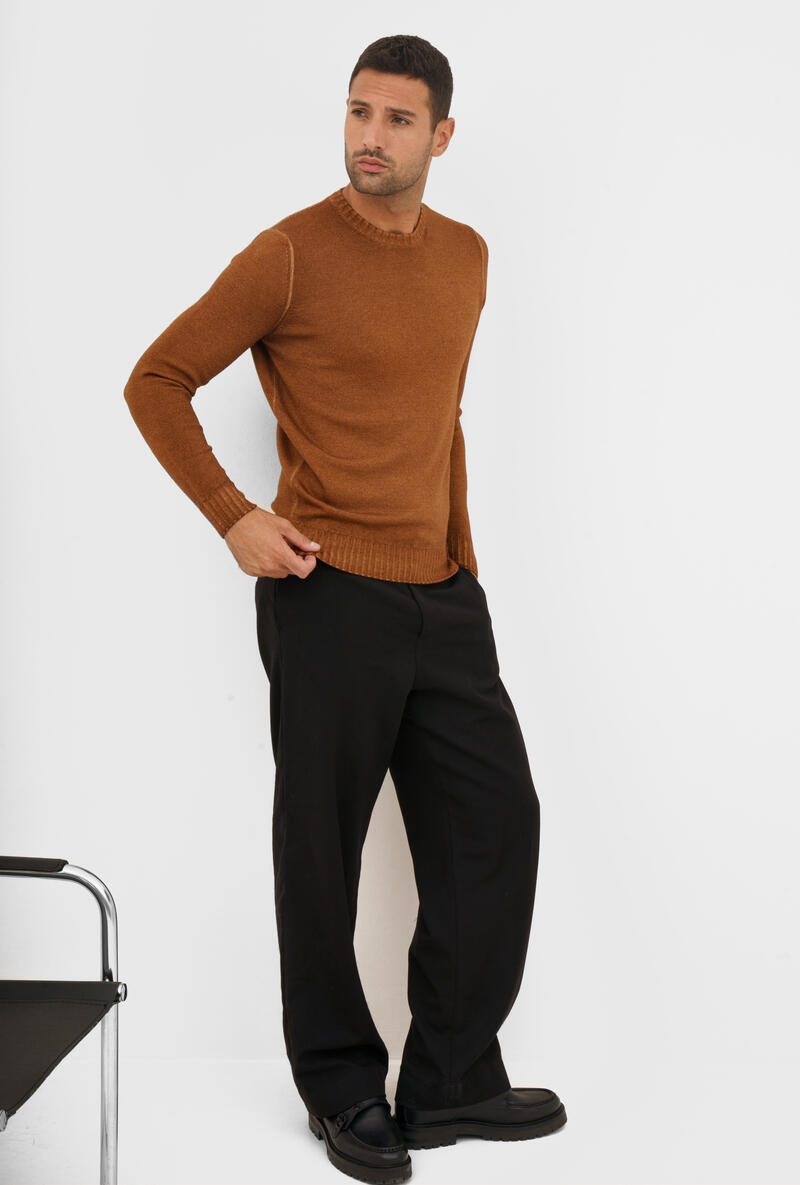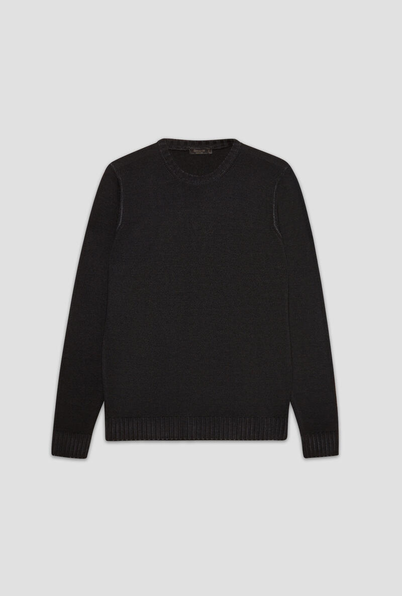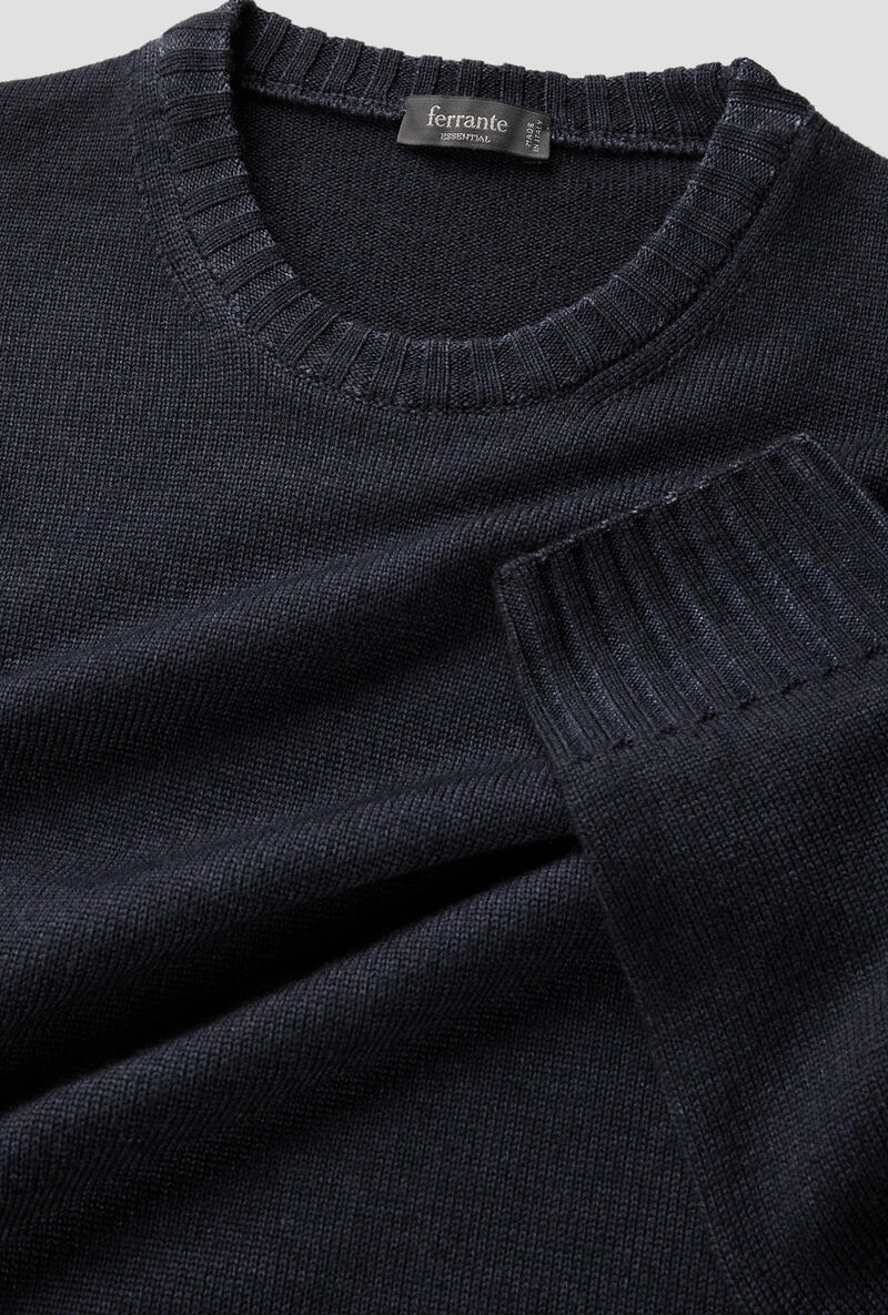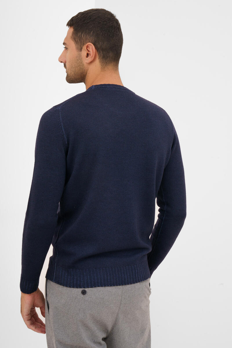Girocollo in lana merinos extrafine, lavorato a due fili , una tintura effetto "fast dye" completa il look. La vestibilità slim arricchisce il capo.