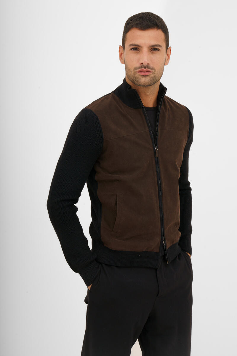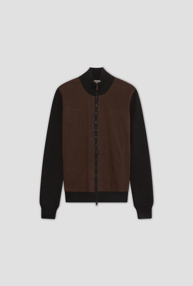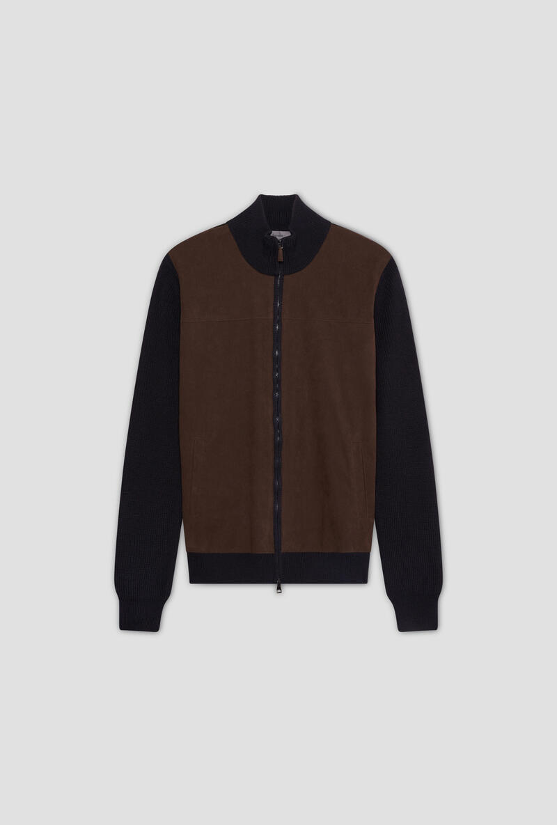 Giacca full zip in pura lana arricchita da una lavorazione maglia inglese su maniche e schiena e dall'applicazione di alcantara sul davanti. Rendendo il capo un must nel guardaroba maschile. Un fit moderno completa il look.