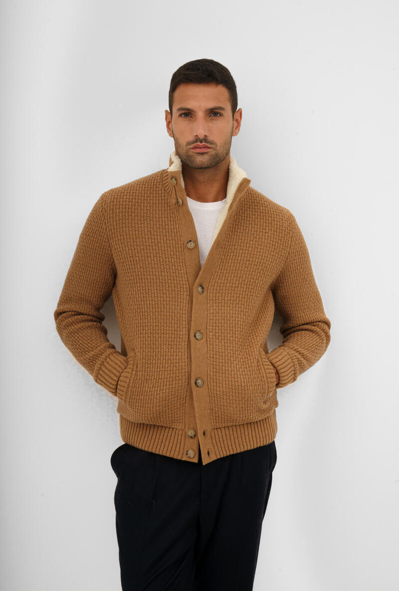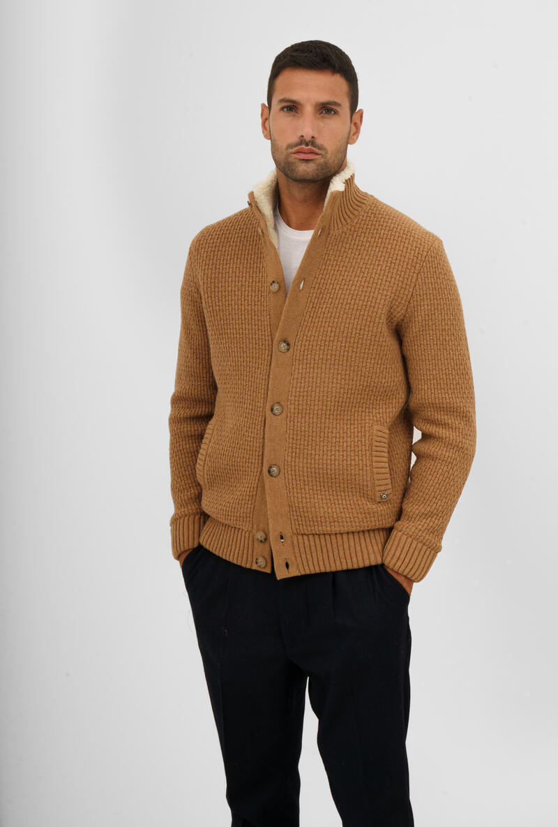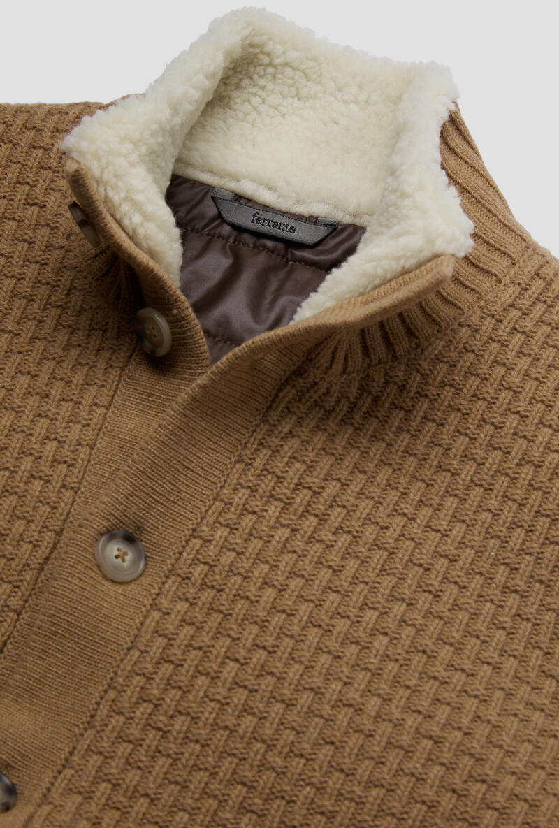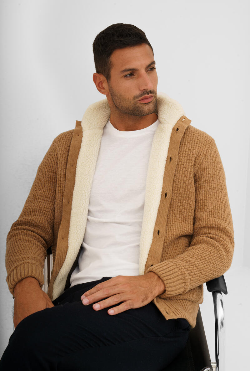 Giubbino in maglia, realizzato con una lavorazione dritto e rovescio all over, foderato con eco pelliccia bouclè.