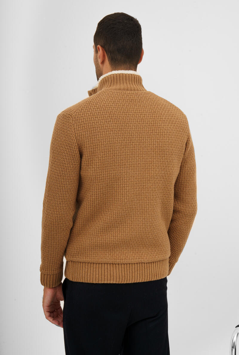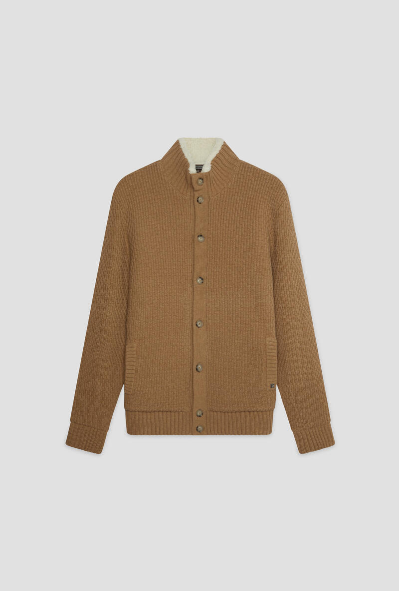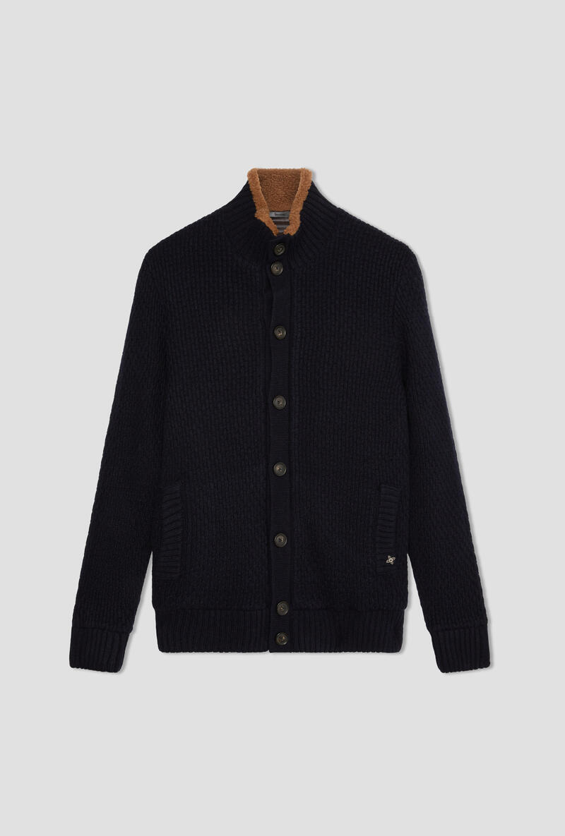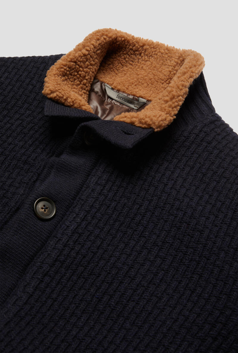 Giubbino in maglia, realizzato con una lavorazione dritto e rovescio all over, foderato con eco pelliccia bouclè.