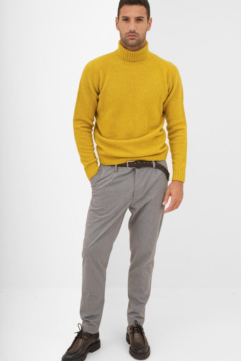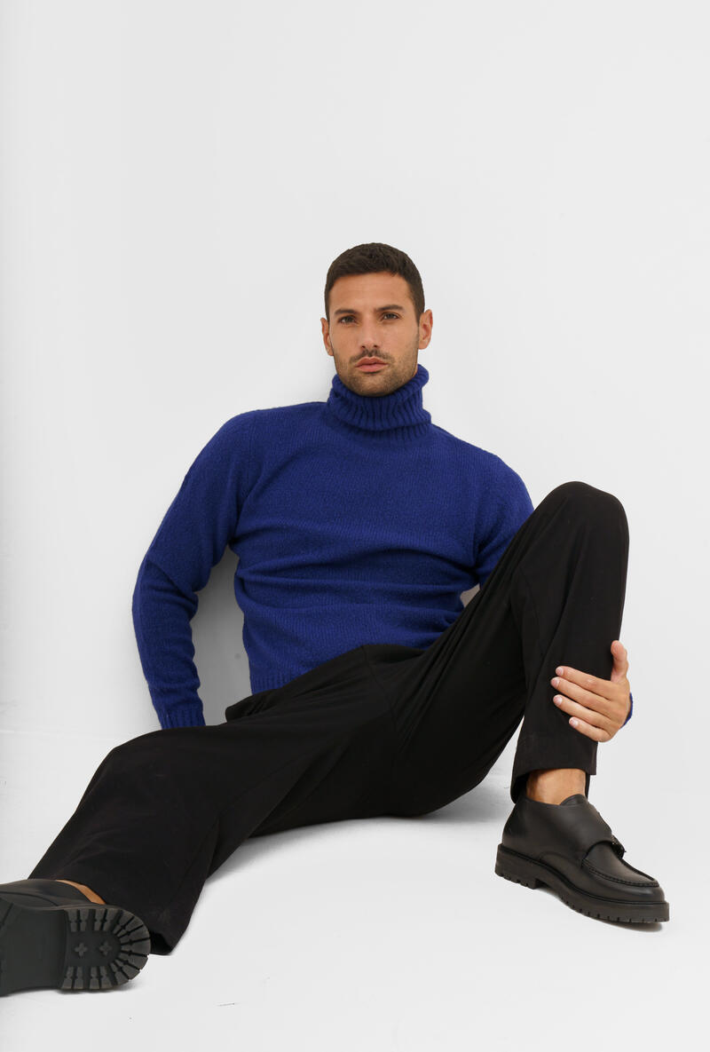 Il modello è alto 1,86 m e indossa la taglia 50.Dolcevita.Bordi in Costina.Made in Italy.